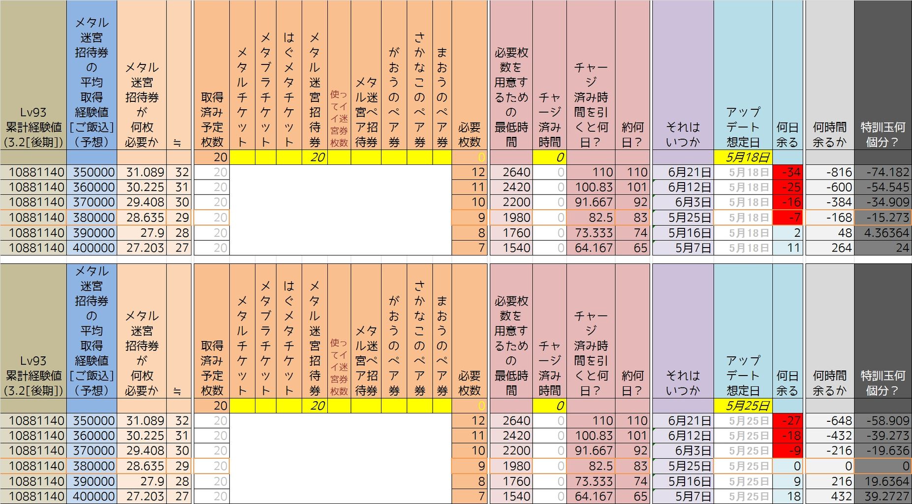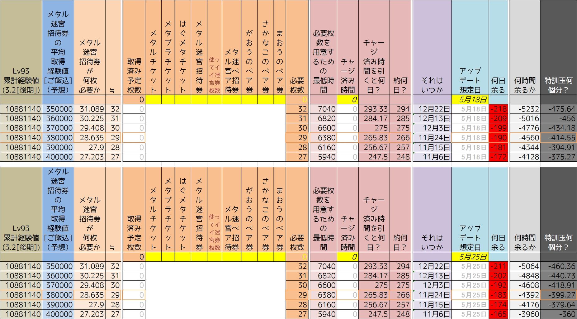 今回はメタル迷宮券もいろいろあるので入力しやすい仕様でエクセルを作りました。